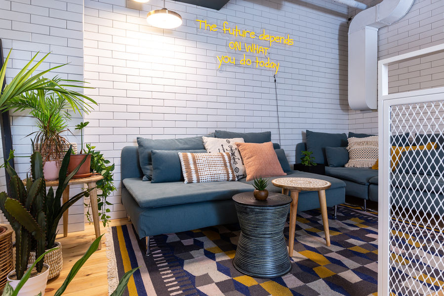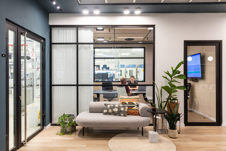 Our main challenge: to create a highly inviting and comfortable a design for company that combines labs and office spaces with a feel of a fun restaurant.