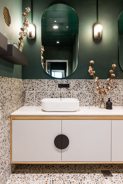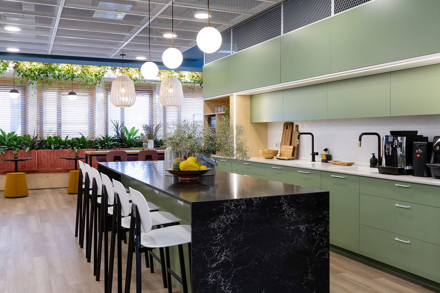 Solution: Using a lot of greens to break the "pharmacy" feel of a lab and bring warm and cold colors together bound in the beautiful kitchen area that reminds a restaurant space